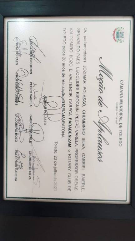 Rotary Club de Toledo recebe "MOÇÃO DE APLAUSOS" da Câmara de Vereadores de Toledo pelos 20 anos de realização da Meia Maratona Rotary Club de Toledo