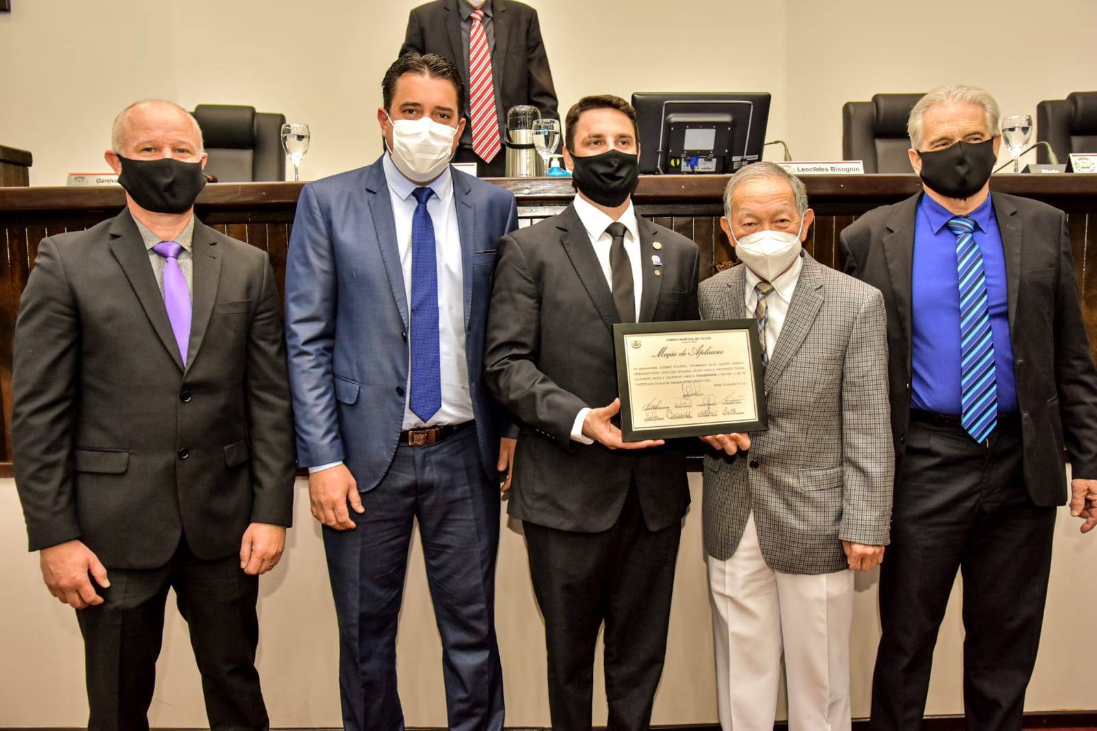 Assinam a Moção de Aplausos os Vereadores Jozimar Polasso propositor da homenagem, o presidente da câmara o vereador Leoclides Bisognin e os vereadores Pedro Varela, Gabriel Baierle, Chumbinho Silva, Genivaldo Paes, Professor Oséias, Valdomiro Bozó e Valtencir Careca.