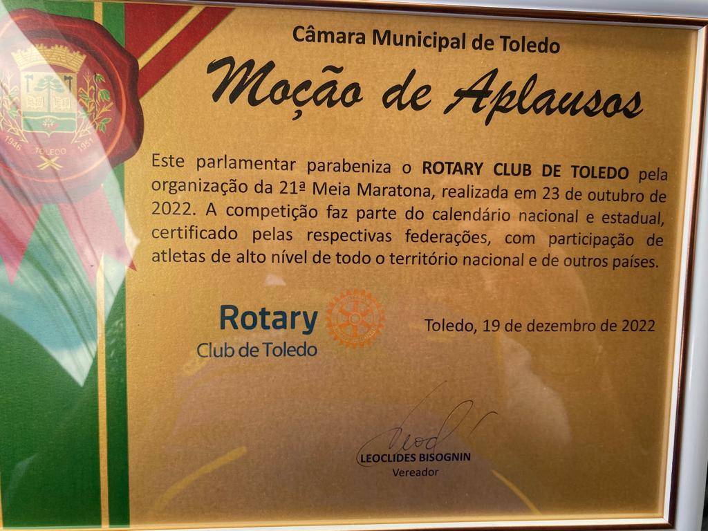 O rotary club de Toledo recebeu neste último dia 19 uma importante moção de aplausos através do Vereador Bisognin pela organização da 21 Meia Maratona …ficamos gratos e engrandecidos com a deferência concedida a este importante evento de fomento à saúde e ao esporte !