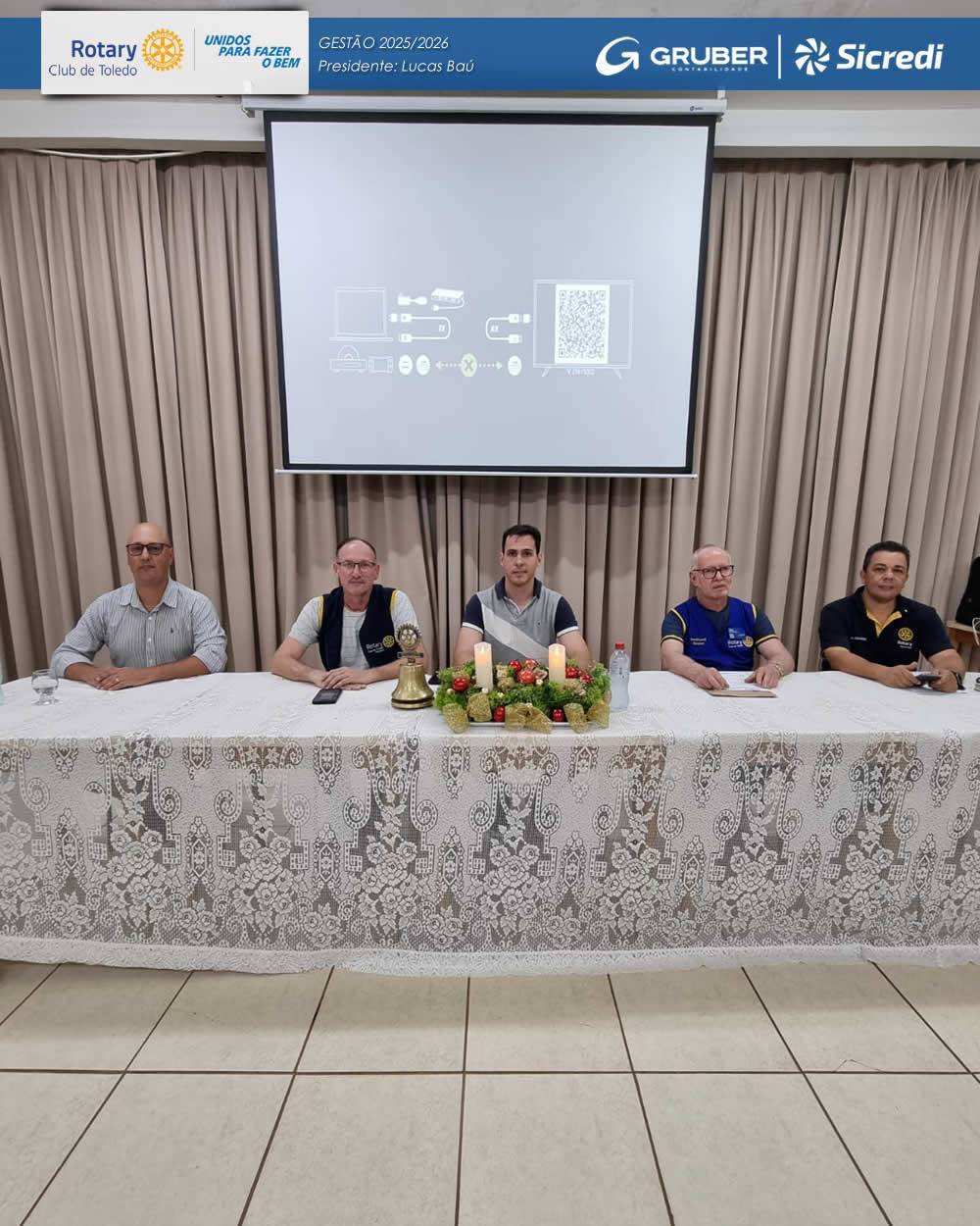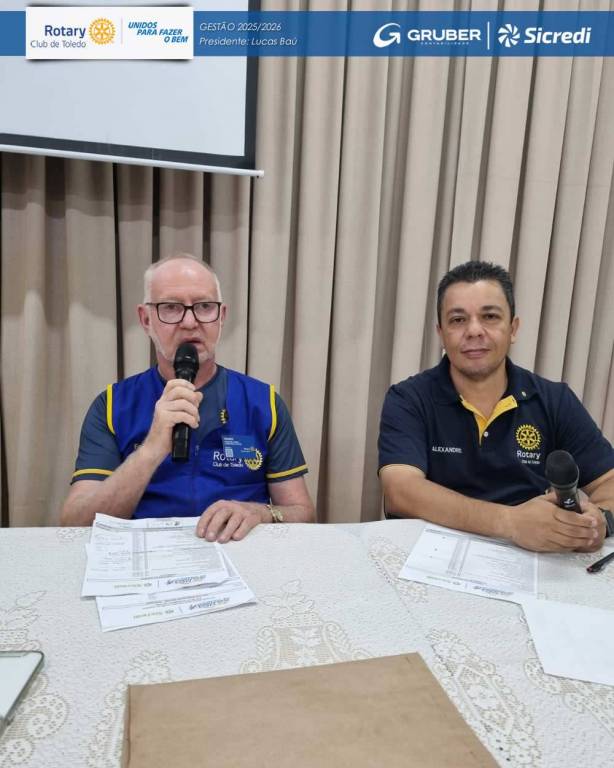 O presidente Lucas Baú também apresentou o fechamento financeiro da Feijoada Drive Thru, realizada em parceria com a CEATO e o Lions, reforçando o compromisso do clube com a transparência e com o impacto social dos projetos realizados. Por fim, foi submetida à votação a participação do Rotary Club de Toledo na Feijoada Drive Thru de maio de 2026, sendo a proposta aprovada pelos companheiros.